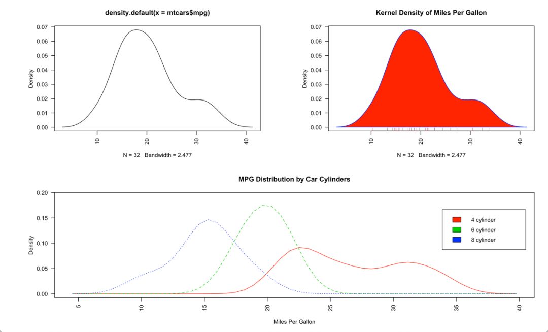 在图12中的密度曲线有时候会单独出现,这时候被称为核密度图。绘制核密度图的方法在图12的代码中已经出现了 (plot(density(x)),下面是几个单独的例子。
