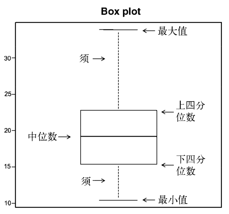 还有一种常见又美观的图形——箱线图(小提琴图是一种特殊的箱线图),其实我们在图形组合中也见过了,绘制方法为函数 boxplot()。小提琴图的绘制方法为vioplot()。最简单的箱线图的例子就不给大家重复了,下面是一幅展示了箱线图中各个元素含义的简图。
