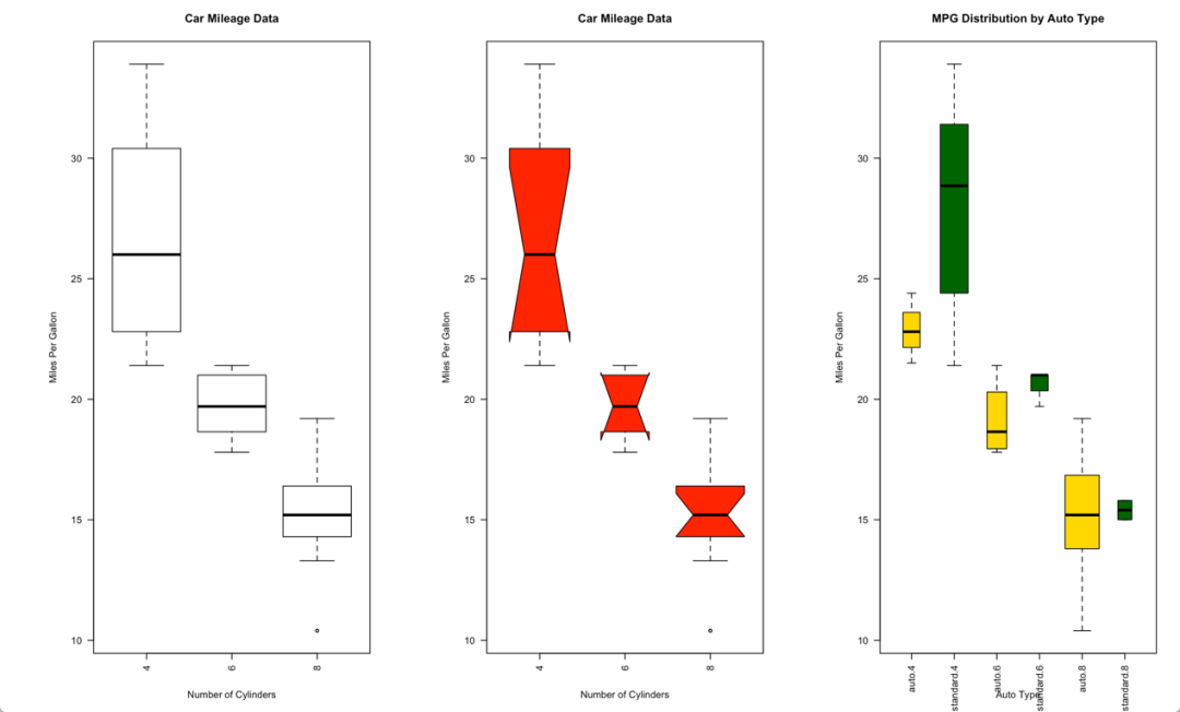 第一幅图利用箱线图进行了跨组比较,第二幅图通过参数 notch 实现了凹槽箱线图的绘制,第三幅图的比较更复杂一些,但基本原理是类似的。