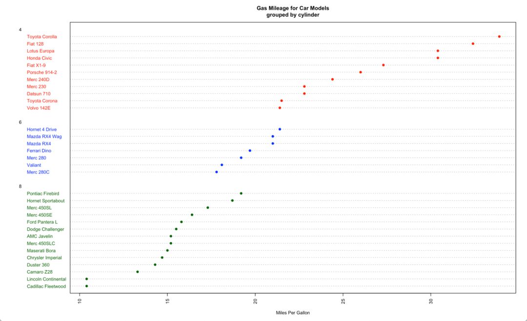 在上图中,我们调整了函数 dotchart() 中的很多参数,可以看到简单的点图也可以展示出很多有用的信息,但是点图的实用性随着数据点的增多会急剧减小。