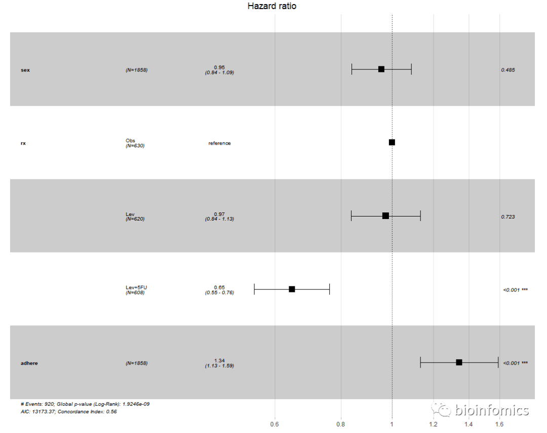 ## coxph(formula = Surv(time, status) ~ sex + rx + adhere, data = colon)