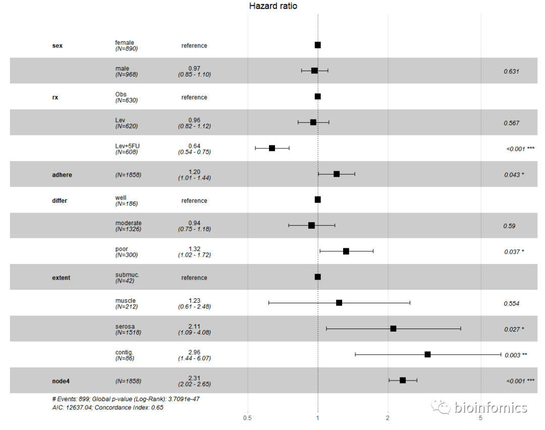 bigmodel <- coxph(Surv(time, status) ~ sex + rx + adhere + differ + extent + node4,