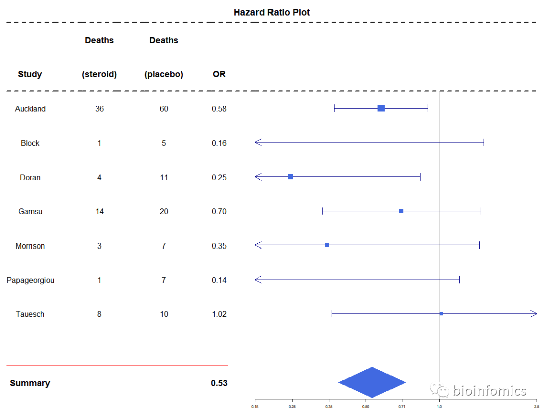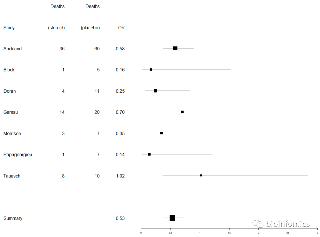 ## [2,] "Study" "(steroid)" "(placebo)" "OR"