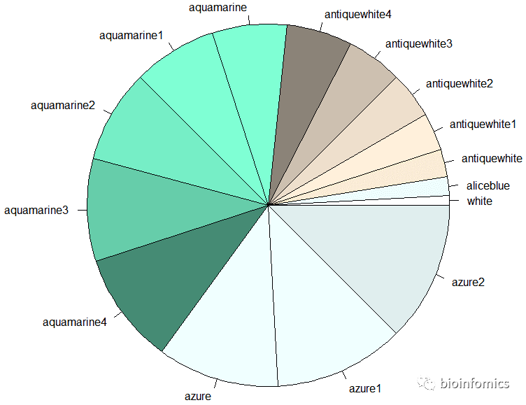pie(1:15,col=cols[1:15],labels = cols[1:15])
