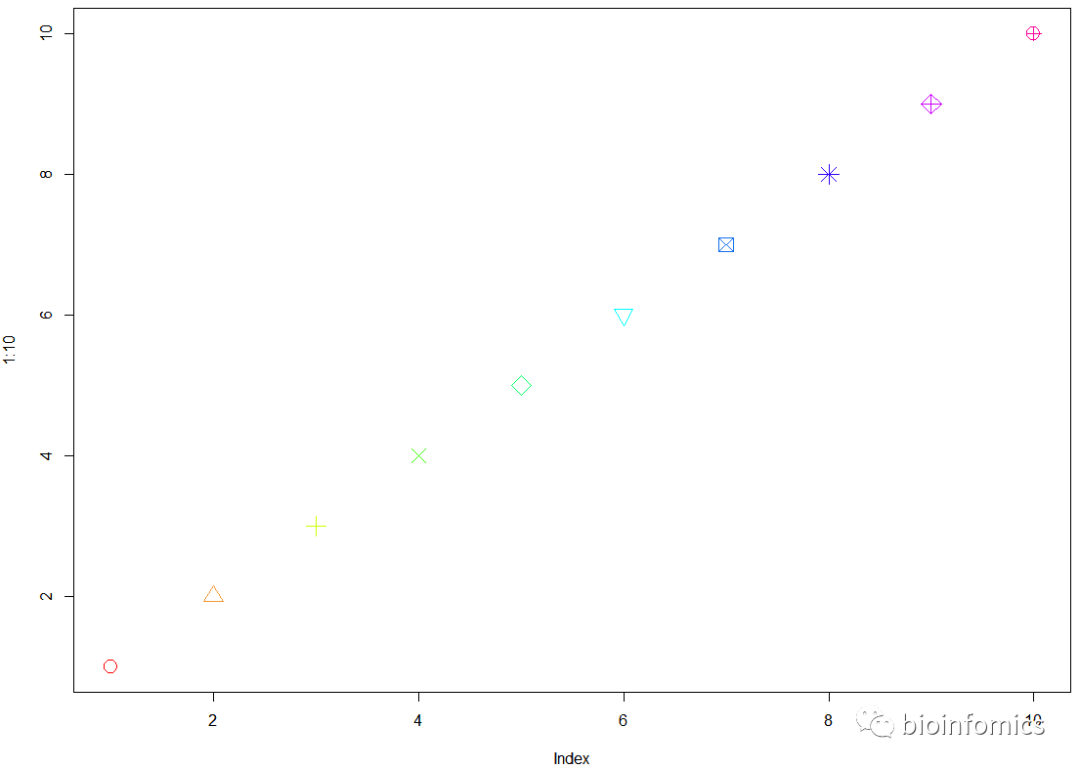 plot(1:10, col=cols, pch=1:10, cex=2)