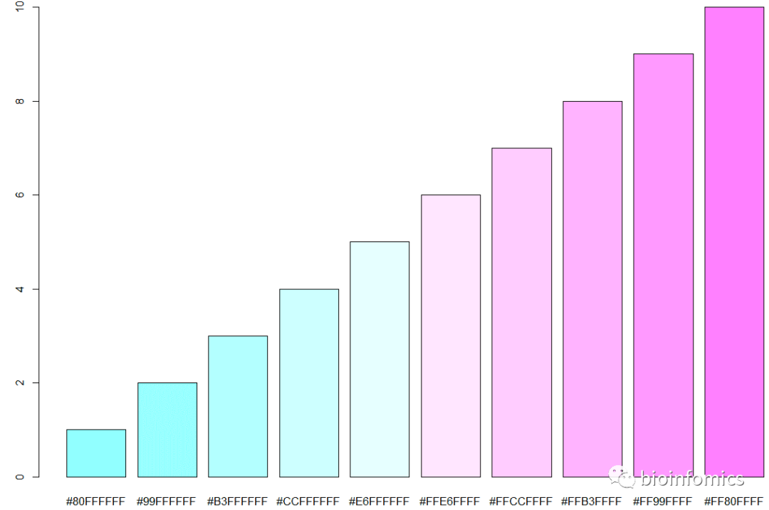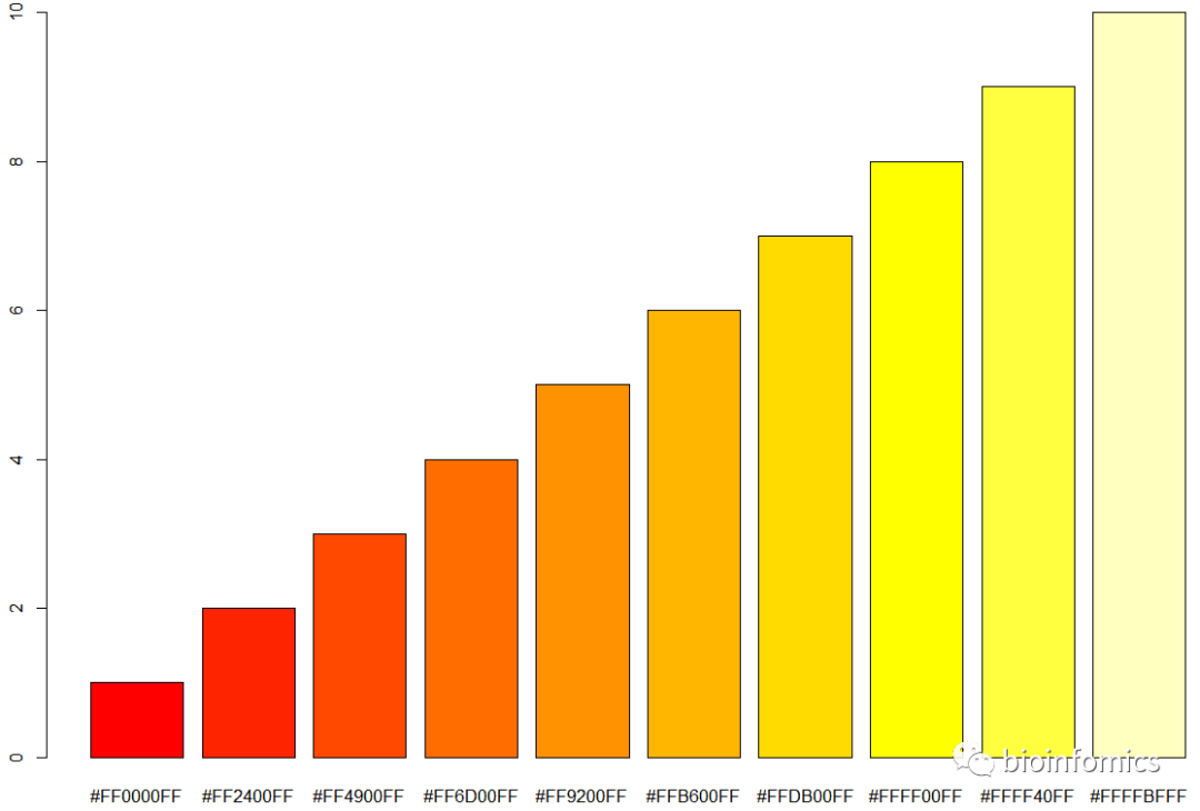 barplot(1:10, col = cols, names.arg = cols)