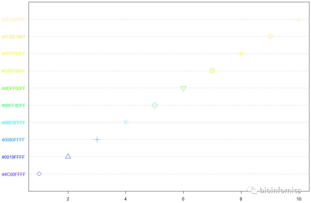 dotchart(1:10, color = cols, pt.cex = 2, pch = 1:10, labels = cols)