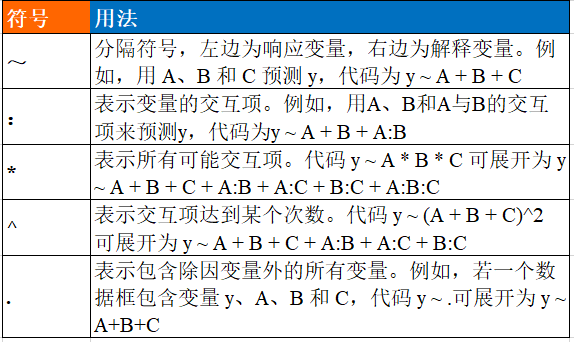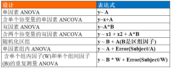 函数aov()的用法和之前接触过的函数略有不同,语法为aov(formula, data=dataframe),参数formula代表了方差分析实验设计中将要研究的变量之间的关系。表1和表2分别列举了表达式中常见的符号和常见的表达式。