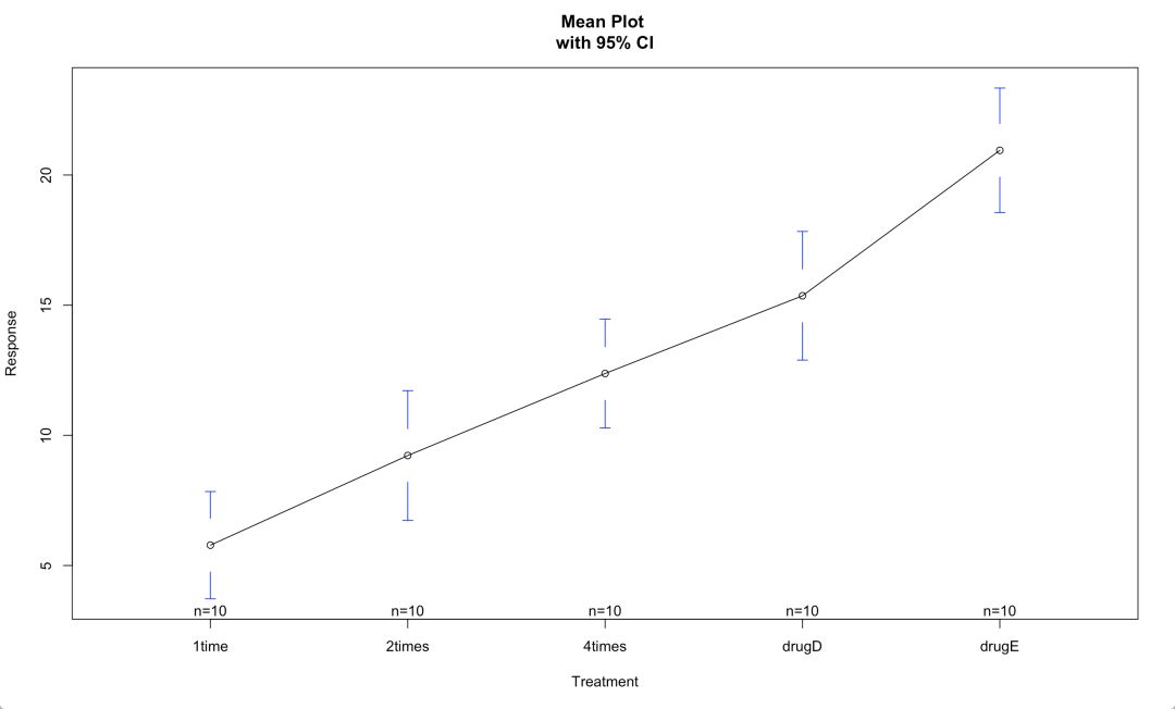 从最简单的情况出发,单因素方差分析中,你感兴趣的是比较分类因子定义的两个或多个组别中的因变量均值。以 multcomp包中的cholesterol数据集为例(实验设计为:50 个患者均接受降低胆固醇药物治疗(trt)五种疗法中的一种疗法。其中三种治疗条件使用药物 3 相同,分别是20mg一天一次(1time)、10mg一天两次(2times)和5mg一天四次(4times)。剩下的两种方式(drugD和drugE)代表候选药物。哪种药物疗法降低胆固醇(响应变量)最多呢?)。利用单因素方差分析对不同疗法做F检验,结果非常显著(p<0.0001)的说明五种疗法的效果不同。(利用包gplot中的函数plotmeans()绘制了组均值图形,图中也可以清楚的看到它们之间的差异。)