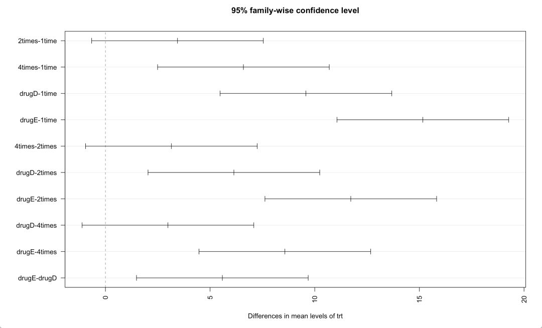 上面的分析之后,你肯定会对究竟哪种疗法与其他疗法不同感兴趣。多重比较可以解决这个问题。函数TukeyHSD()可以回答你的疑问。利用函数plot()将多重比较结果绘制为图形,图形中置信区间包含0的疗法说明差异不显著(p>0.5)。
