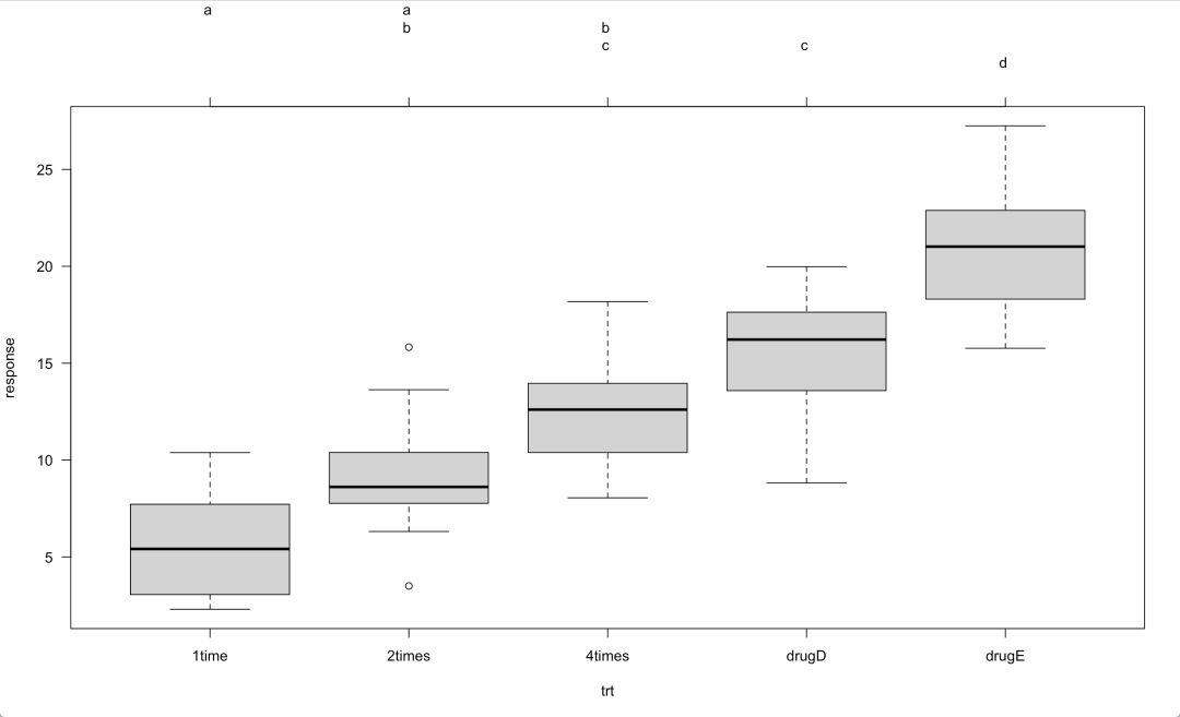 包multcomp中的函数glht()函数提供了多重均值比较更为全面的方法,下面是图形化的分析结果。代码中,函数cld()中的参数level设置了使用的显著水平(0.05,即本例中的95%的置信区间)。有相同字母的组(用箱线图表示)说明均值差异不显著。(做完上面这些工作并不意味着分析结束了,必须要检查数据是否满足统计检验的假设条件的程度,单因素方差分析中,我们假设因变量服从正态分布,各组方差相等。可以使用Q-Q图(函数qqPlot())来检验正态性假设,用函数bartlett.test()检查方差齐性。后台代码已提供示例。)
