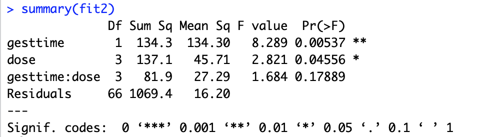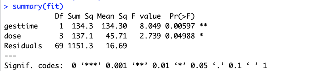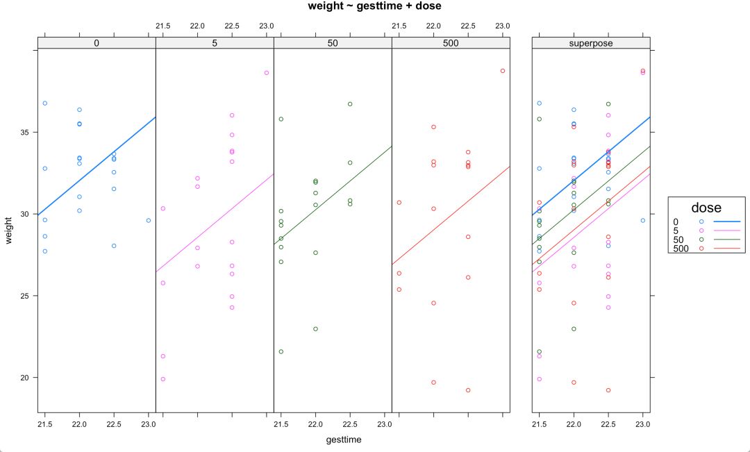 图5中,可以看到交互效应不显著,支持了斜率相等的假设。若假设不成立,可以尝试变换协变量或 因变量,或使用能对每个斜率独立解释的模型,或使用不需要假设回归斜率同质性的非参数 ANCOVA方法。包sm中的函数sm.ancova()为后者提供了一个例子。还可以用包HH中的函数ancova()对单因素协方差分析的结果进行可视化。从图6中可以看出,用怀孕时间来预测出生体重的回归线相互平行,只是截距项不同。随着怀孕时间增加,幼崽出生体重也会增加。另外,还可以看到0剂量组截距项最大,5剂量组截距项最小。(不妨尝试一下将代码中ancova(weight~gesttime+dose)改为ancova(weight~gesttime*dose),图片出现了什么变化呢?)
