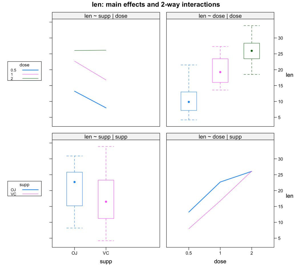 讨论完单因素方差分析,我们来看一下更复杂的情形:双因素方差分析和重复测量方差分析。在双因素方差分析中,受试者被分配到两因子的交叉类别组中。以基础安装中的 ToothGrowth数据集为例,随机分配60只豚鼠,分别采用两种喂食方法(橙汁或维生素C),各喂食方法中抗坏血酸含量有三种水平(0.5mg、1mg或2mg),每种处理方式组合都被分配10只豚鼠。其中,牙齿长度为因变量。分析结果可以采用函数interaction.plot()、包gplots中的函数plotmeans()或者包HH中的函数interaction2wt()来可视化,下面展示一下函数interaction2wt()的例子。(三种方法中,更推荐包HH中的函数interaction2wt(),因为它能展示任意复杂度设计(双因素方差分析、三因素方差分析等)的主效应(箱线图)和交互效应。代码中提供了三种方法的示例,大家可以自己选择偏好的方式。)