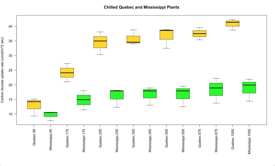 而所谓重复测量方差分析,即受试者被测量不止一次。示例来源于基础安装包中的CO2数据集,包含了北方和南方牧草类植物Echinochloa crus-galli的寒冷容忍度研究结果,在某浓度二氧化碳的环境中,对寒带植物与非寒带植物的光合作用率进行了比较。因变量是二氧化碳吸收量(uptake),自变量是植物类型Type和七种水平的二氧化碳浓度(conc)。另外,Type是组间因子,conc是组内因子。Type已经被存储为一个因子变量,还需要将 conc转换为因子变量。方差分析表表明在0.01的水平下,主效应类型和浓度以及交叉效应类型×浓度都非常显著,图8中通过函数boxplot()展示了交互效应。