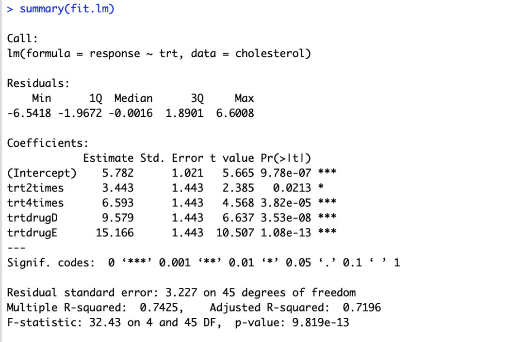 最后,我们来兑现教程最开始的“诺言”,给大家介绍一个用回归来做的方差分析。实际上,ANOVA和回归都是广义线性模型的特例,前面所有的设计都可以用函数lm()来分析。以单因素方差分析实例为例,即比较五种降低胆固醇药物疗法(trt)的影响。结果如下: