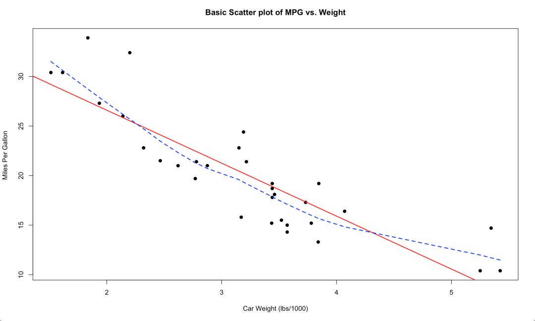 散点图可用来描述两个连续型变量间的关系。这里以R中自带的mtcars数据为例绘制第一个示例图。为了展示图中两个变量的关系,我们加上了两条拟合曲线,分别来自于函数 lm() 和函数 lowess()。