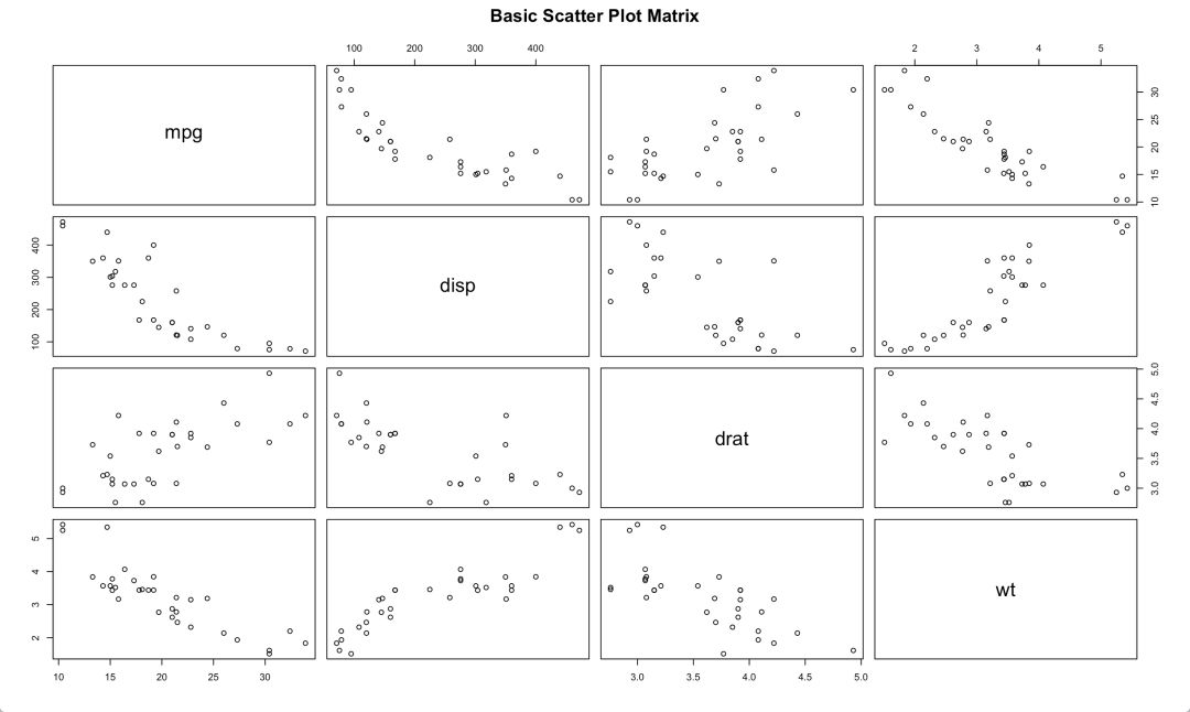 一个散点图可以展示两个变量之间的关系,如果有多个变量呢?散点图矩阵可以解决这个问题。散点图矩阵对应的函数是 pairs(),图2 就是一个很好的例子。