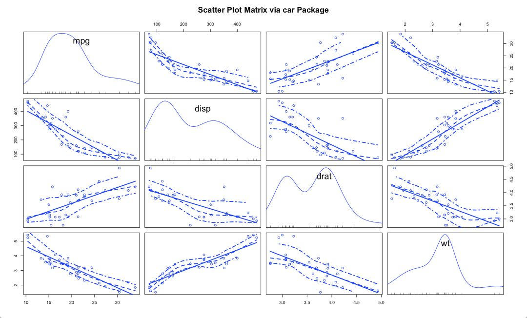 在上图中,对角线上的变量名说明了每幅图形对应的两个变量。同时,不难发现,对角线上下的图形是相同的,可以通过参数 upper.panel = NULL 来控制只生成下三角的图形。同样的,在 包car 中也有函数 scatterplotMatrix() 可以绘制散点图矩阵。下面给出了一个例子。
