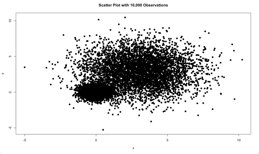 散点图固然直观,但也不是完美的,在大数据时代,散点图就显得力不从心了。比如,10,000个观测点的案例中的散点图是这样的。