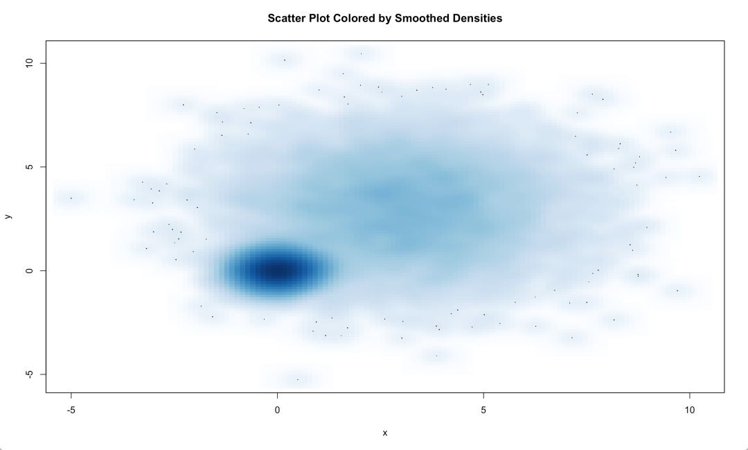 乌压压的一片,啥也看不到~ 这种情况下,高密度散点图可以帮我们解决困难。比如函数 smoothScatter()。