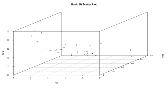 在二维坐标系中的散点图可以展示二元变量关系,那三维坐标系一定可以展示三元变量关系了。但是,人们对于三维散点图的观测能力是远不如二维散点图的。下面是一个简单的三维散点图的例子(可用scatterplot3d包中的 scatterplot3d()函数来绘制它们的关系)。