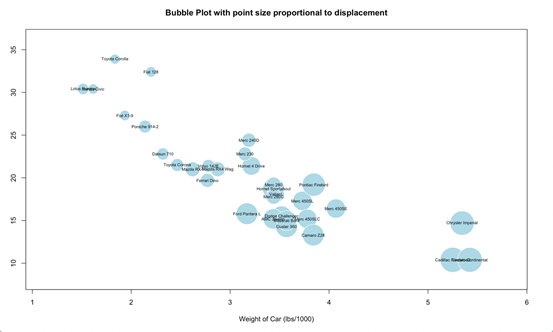 相信接触过功能富集之类分析工作的同学对气泡图不会陌生。这是另一种展示三个变量间的关系的方法。可用symbols()函数来创建气泡图。下面是一个气泡图的示例。