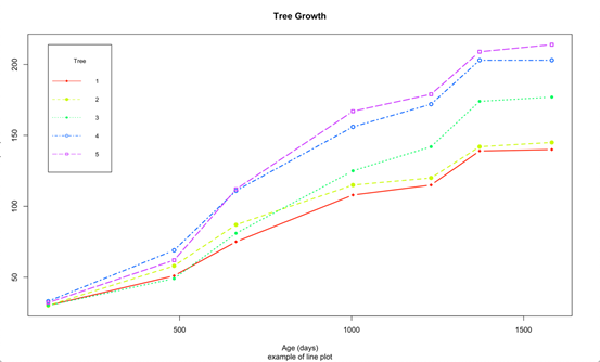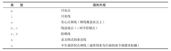 散点图很多时候能帮我们发现数据中隐藏的一些关系,但如果要观察某个变量的变化趋势,折线图会是更好的选择。绘制折线图的主要函数包括了plot(),lines()。两者的主要区别在于lines()并不自己生成图形,而是在已有图形上添加信息。两个函数中控制生成图形的参数为type。参数type的选项如下: