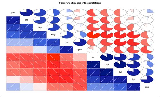 折线图和散点图中的变量关系都只能靠我们自己定性判断,如果要得到定量的相关关系,该怎么办?相关图可以解决这个问题,下面是一个简单的例子,主要用到的函数为corrgram()。由于我们还没接触到R中的数据分析,这个图形的具体含义就不给大家解释了,在紧接着的几次讲完统计分析之后,再给大家补充这部分内容。
