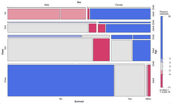 上图中,以R中自带的Titanic数据集为例,它包含存活或者死亡的乘客数、乘客的船舱等级(一等、二等、三等和船员)、性别(男性、 女性),以及年龄层(儿童、成人)等信息。这是一个被充分研究过的数据集。观察图形可以得到大量的数据信息。大家可以通过代码ftable(Titanic)得到更多详细信息。