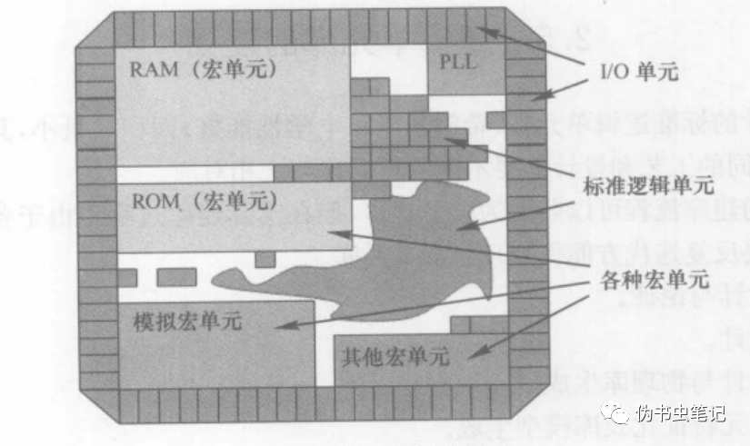 standard cell 放置于芯片的核心(core)区起着逻辑粘连的作用(glue logic)。macro block同样放置在核心区,在数字集成电路设计中,它至少包括嵌入式存储器(RAM/ROM)、IP、COT等模块,他们也可以被看作特殊的非标准单元库,其他的一些重要的模块还有PLL(它属于模拟模块)和DSP模块等。输入输出单元放置在core区的周围,用于芯片信号的输入输出和电源供给。
