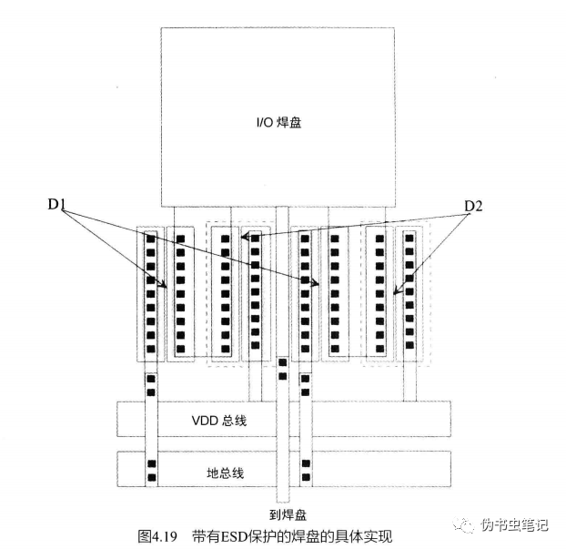 如上图所示是一个带有ESD保护的I/O pad;