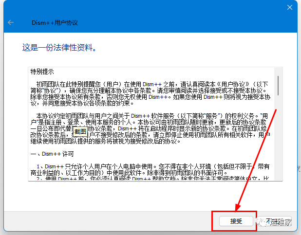 我们点击“Dism++x86.exe”,选择“接受”;