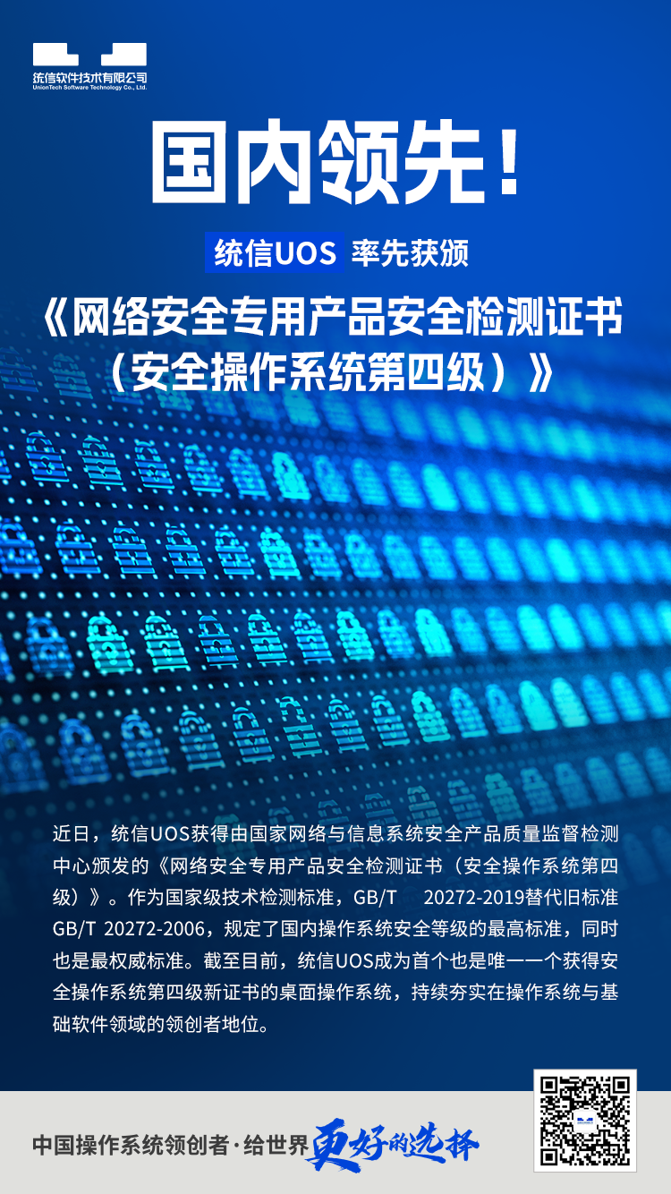 这意味着,统信UOS成为继2023年4月四部委联合发文宣布自2023年7月1日起停止颁发《计算机信息系统安全专用产品销售许可证》后的首个、也是目前唯一一个获得安全操作系统第四级新证书的桌面操作系统,充分体现统信软件在操作系统与基础软件领域的领创者地位。