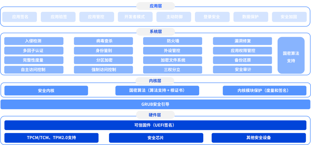 统信UOS支持可信计算3.0,在硬件层结合安全芯片提供硬件可信根,在内核层提供可信密码模块和可信度量、可信审计模块,在系统层实现可信启动和可信度量,软硬件一体,构建完整的安全信任链。