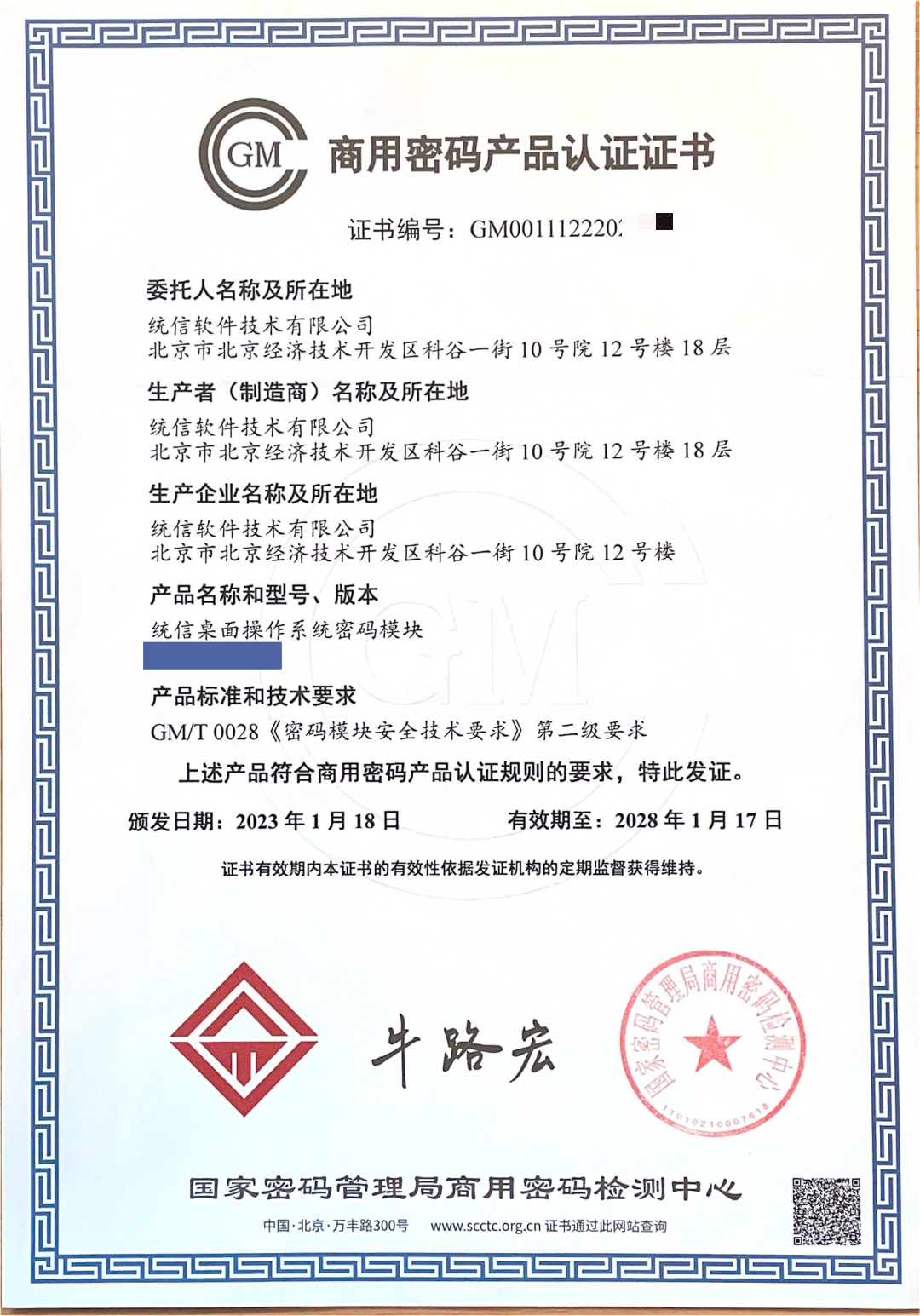 统信UOS桌面版V20已通过国家密码管理局商用密码检测中心《密码模块安全技术要求》第二级要求,获颁《商用密码产品认证证书》。