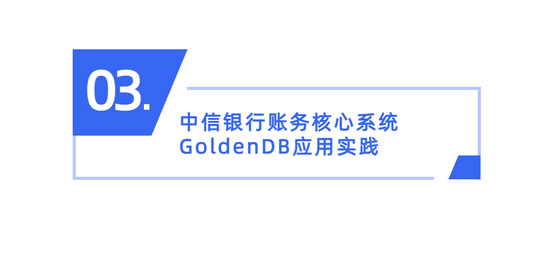 总行账务核心业务迁移,于2020年5月3日投产;其中,卡中心核心业务系统,从2017年10月开始立项,经过数十轮的跟账验证、试运行及切换演练后,新一代信用卡核心业务系统StarCard于2019年10月26日正式投产。新系统将信用卡系统的三大服务:授权服务,账户服务,数据服务核心业务系统从AS400下移到X86集群,12T的核心数据(1亿用户数据)从DB2迁移到GoldenDB。总行账务核心业务系统于2020年5月3日投产,GoldenDB成为国内首个在大型商业银行核心业务投产的我国数据库。两大核心业务投产后,顺利通过网联压测、双11、会员日及抢购兑换等一系列高频交易的现网考验,至今稳定运行超3年。目前系统承载3亿账户、15亿账户、日均交易3亿笔、累计交易额超10万亿。经过与中信银行长达6年的紧密合作,GoldenDB在2019和2020年,分别实现大型股份制信用卡核心业务和总行账务核心业务投产,由此,GoldenDB成为国内第一个在大型银行信用卡账务核心实现上线的我国数据库,也是目前业界唯一达到金融账务核心商用水平的我国分布式数据库产品。截至目前,GoldenDB在中信银行核心系统已稳定运行接近三年,未出一次事故,未打一个补丁,可靠性达到6个9,达到大型机水平。实现了数据库技术自主可控,树立了行业典型。