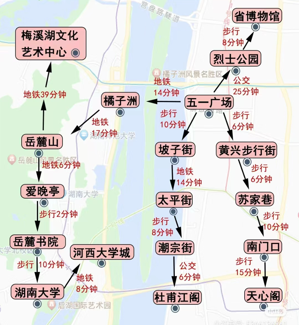 网上有很多长沙的旅行攻略,诸如下图这种,各位可以结合自身情况,选择不同的旅行路线,可以是"特种兵",可以是"养生游",因为各种原因,我们选择的后者。