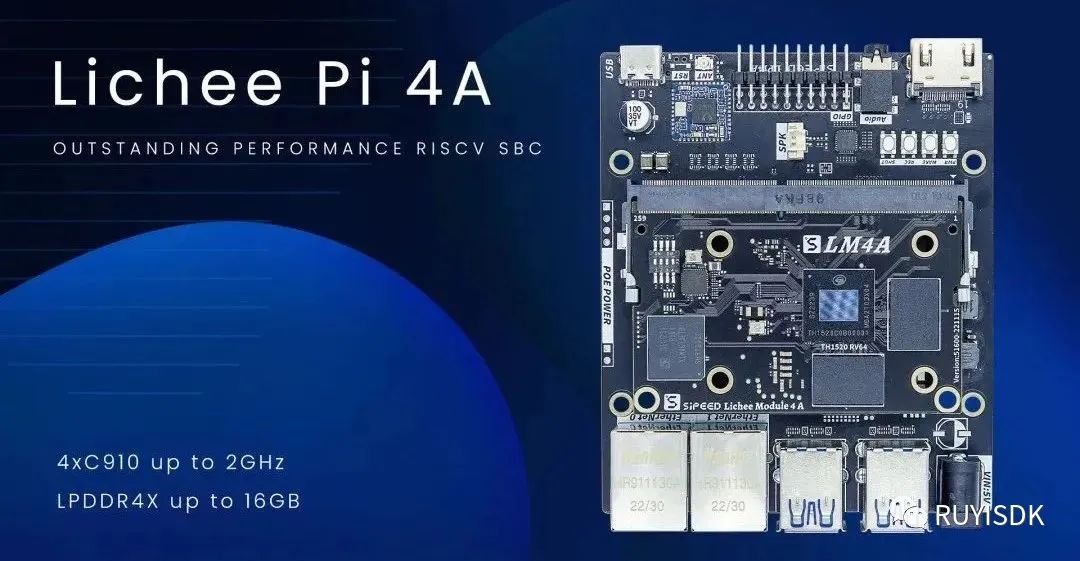 Sipeed矽速科技推出的 LicheePi 4A 是首款与树莓派4性能相匹敌的RISC-V开发板,基于 TH1520 模组,搭载 4 核 2.0GHz C910 内核、4TOPS NPU 和 50GFLOPS GPU,为开发者提供强大的性能,满足各种应用场景需求。除此之外,它还支持千兆以太网、USB 3.0、HDMI 2.0等丰富外设,并集成WiFi、蓝牙及MIPI接口。这些丰富的硬件特性使得 LicheePi 4A 成为一个功能强大且灵活的开发平台,满足开发者在各个领域的需求。