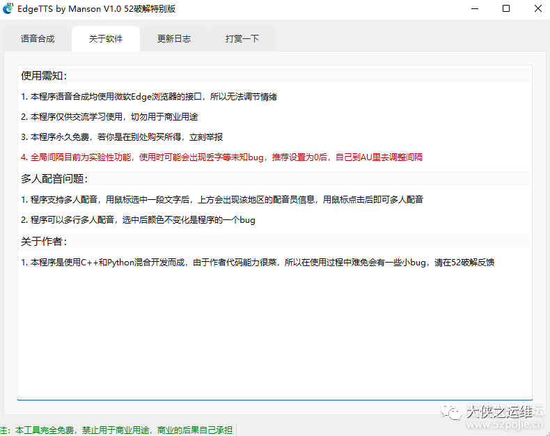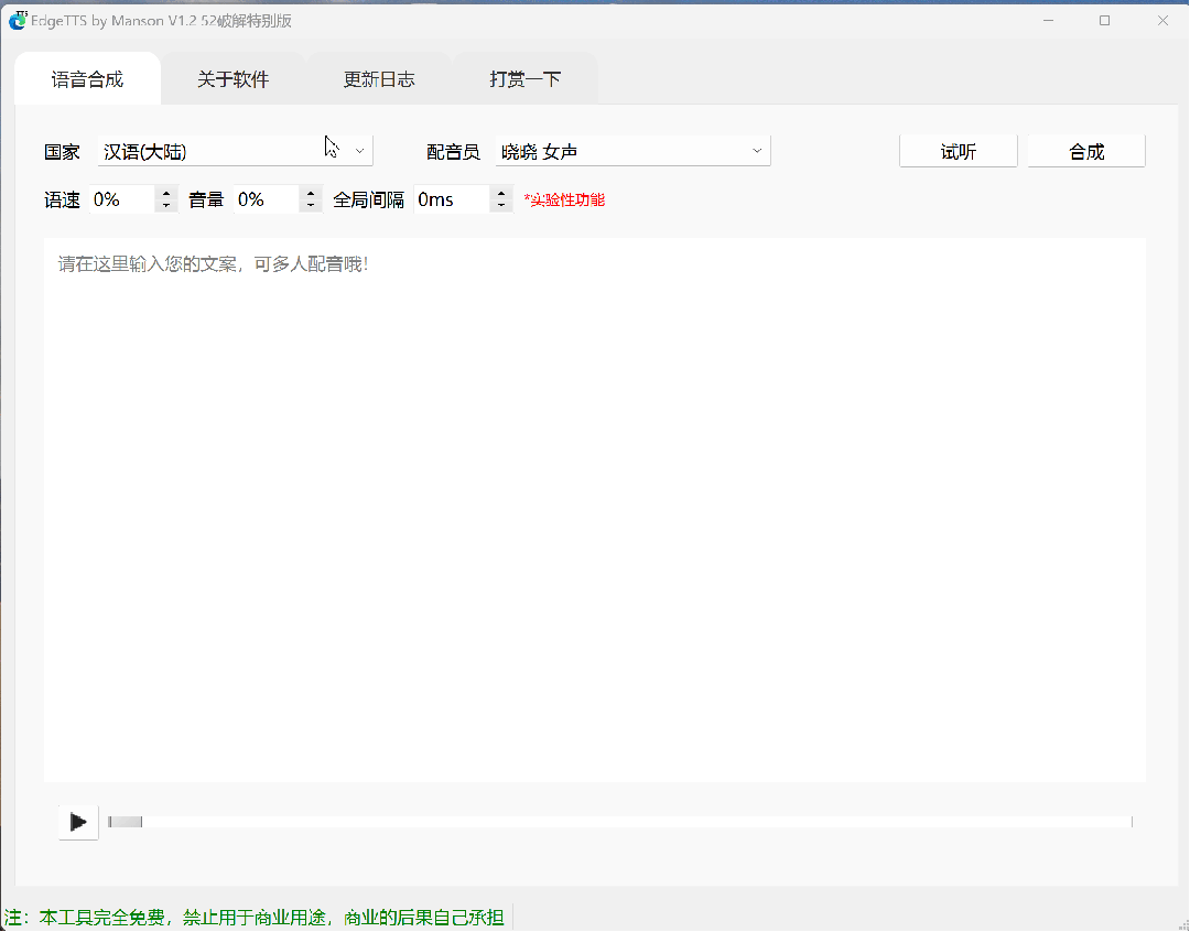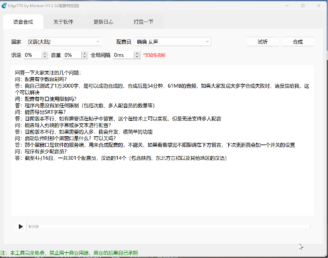 免费且无限制: Edge-TTS是完全免费的,没有使用次数限制。用户可以随意使用,不用担心会被收费。