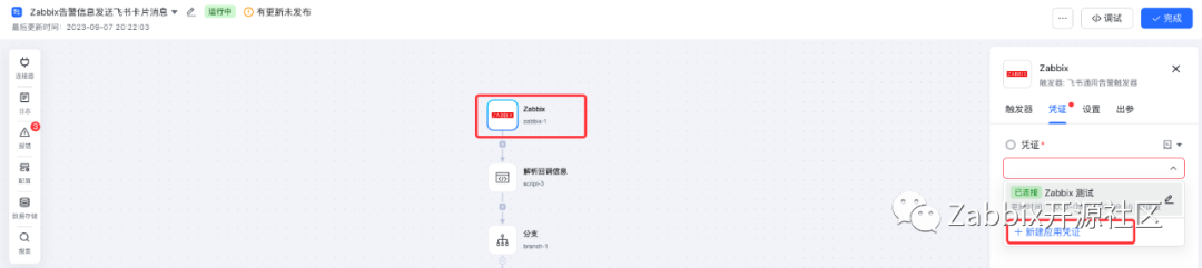 点击工作流中的 Zabbix 节点,在右侧 凭证 页面配置新建/选择已有的“Zabbix应用授权”凭证,下文以“新建”为例: