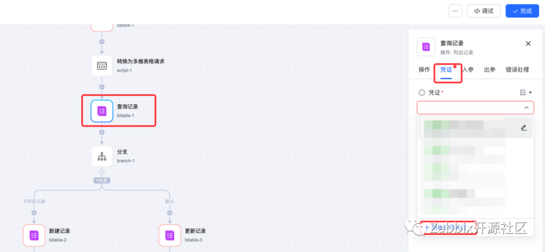 点击 查询记录 节点右侧的 凭证,新建/选择已有的“飞书应用授权”凭证,下文以“新建”为例: