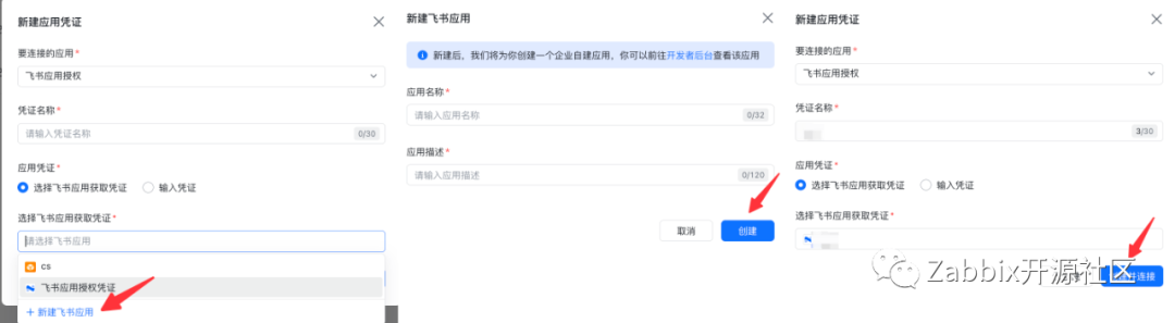 新建应用凭证时,填入必填项后,点击 创建并连接。