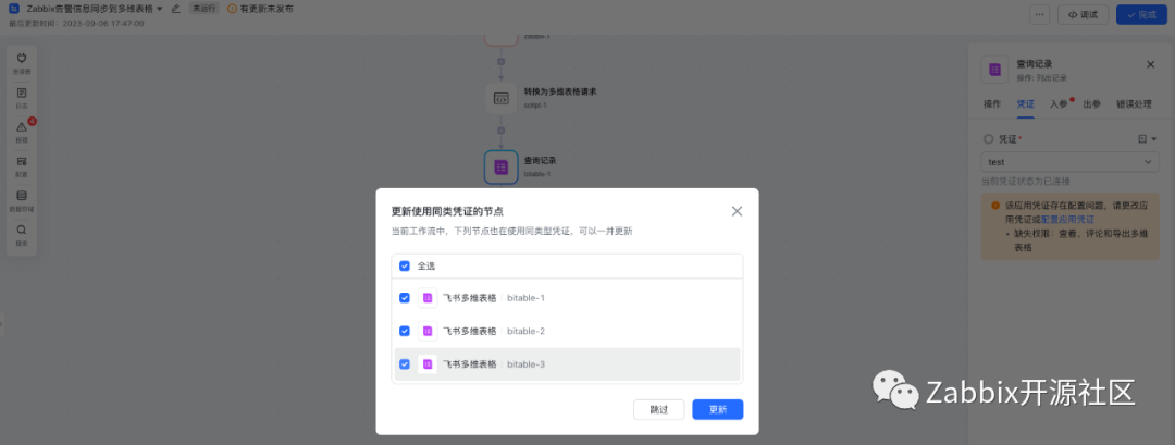 b.将创建的“飞书应用授权”凭证,批量更新到剩余的“飞书系”连接器节点。