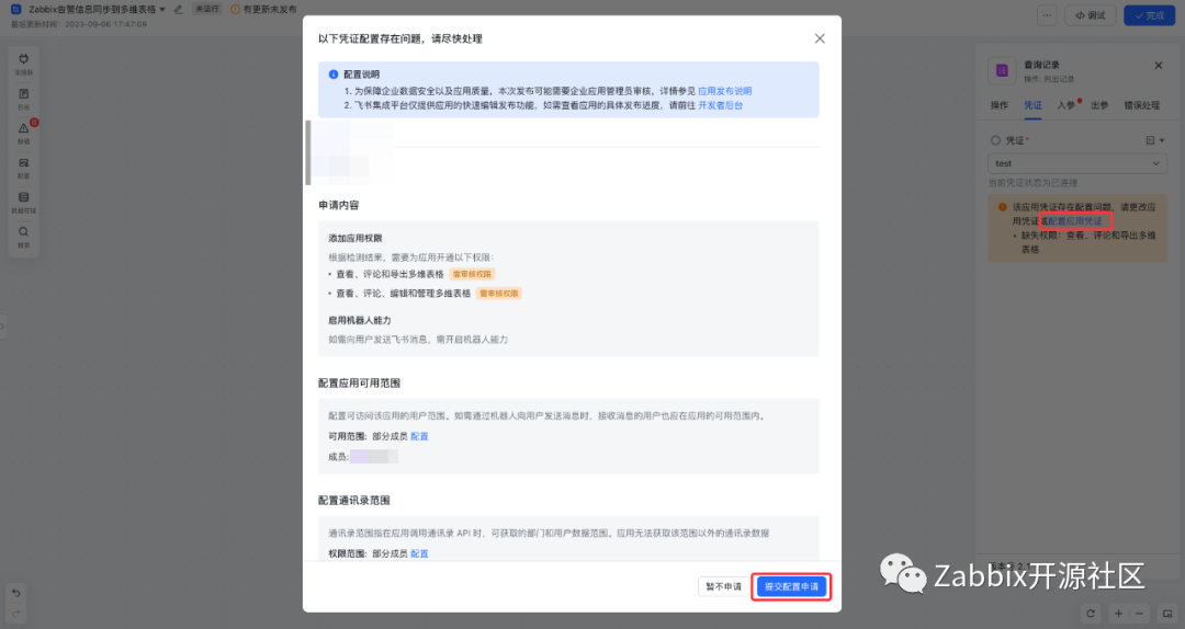 c. 选择好凭证后,如果该凭证需要额外申请权限,可在下提示信息中点击 配置应用凭证 ,一键提交配置申请。