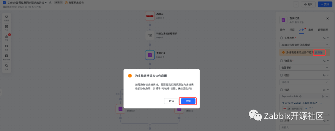 如果多维表格没有添加当前的应用,会添加协作应用,点击去添加,然后选择确认即可。