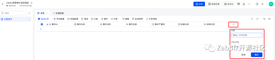 使用模板Zabbix告警事件信息模版 ,创建一篇如下图所示的多维表格文档。