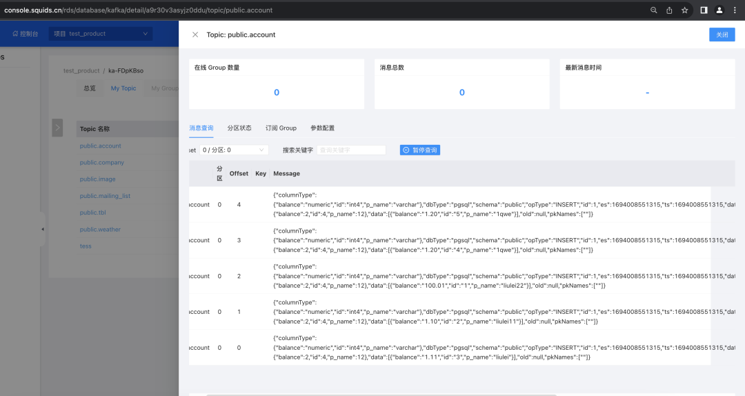 投递到一个topic里面时,需要用户选择已有的topic名称;并且选择a) 按库/表名hash到不同partition,b) 按主键hash到不同partition,c) 集中投递到partition0。