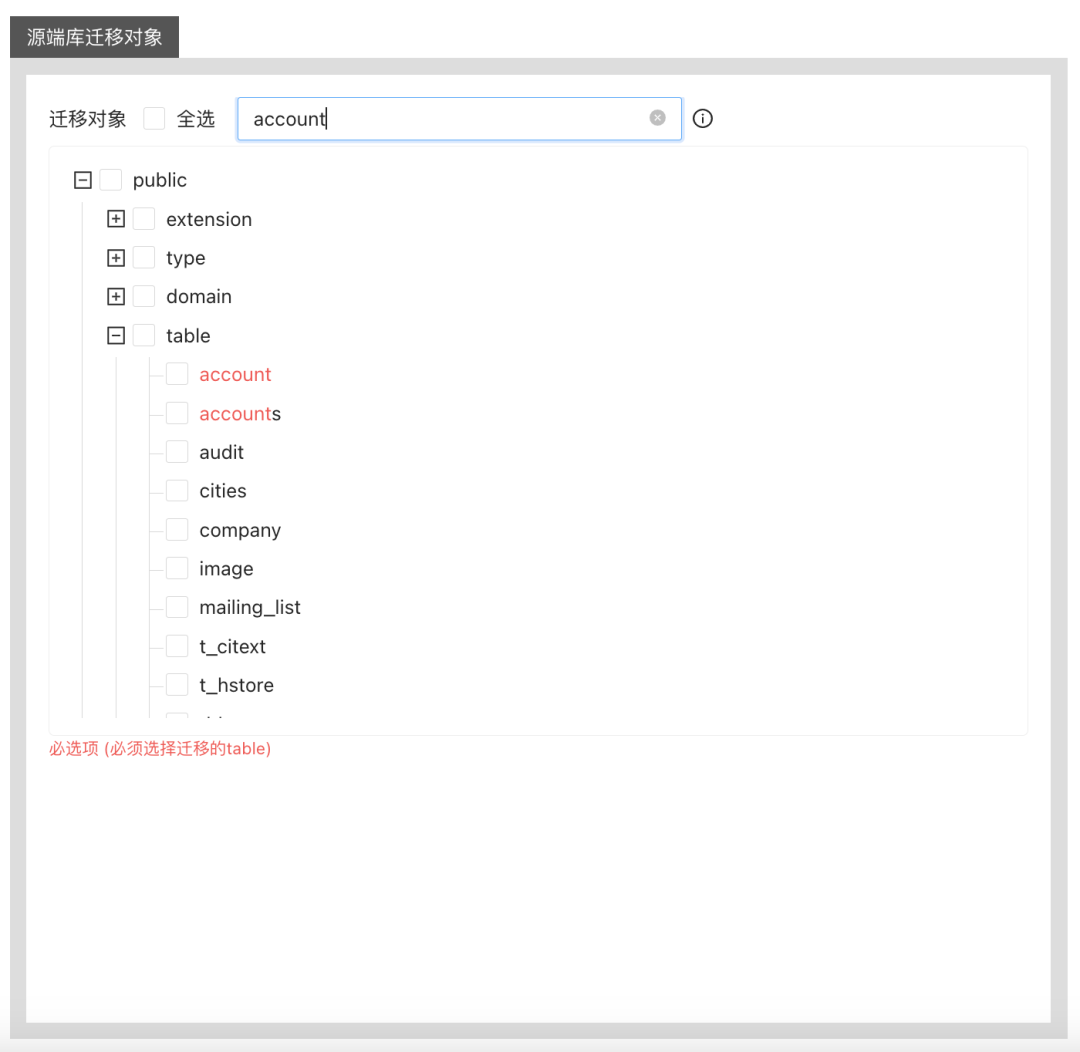 另外,在源端对象选择时,可以输入对象名称,对象选择树上的相关节点会标红,在对象特别多的时候,便于用户快速找到对应名称的对象。