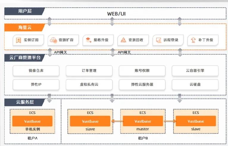vCloud数据库云管平台主要提供基于华为云ManageOne平台、阿里云ASCM平台及腾讯云Tstack平台的RDS服务,支持Vastbase数据库集群的全生命周期管理。在实例运维层提供常用的实例创建、弹性扩缩、规格升降级等运维功能。