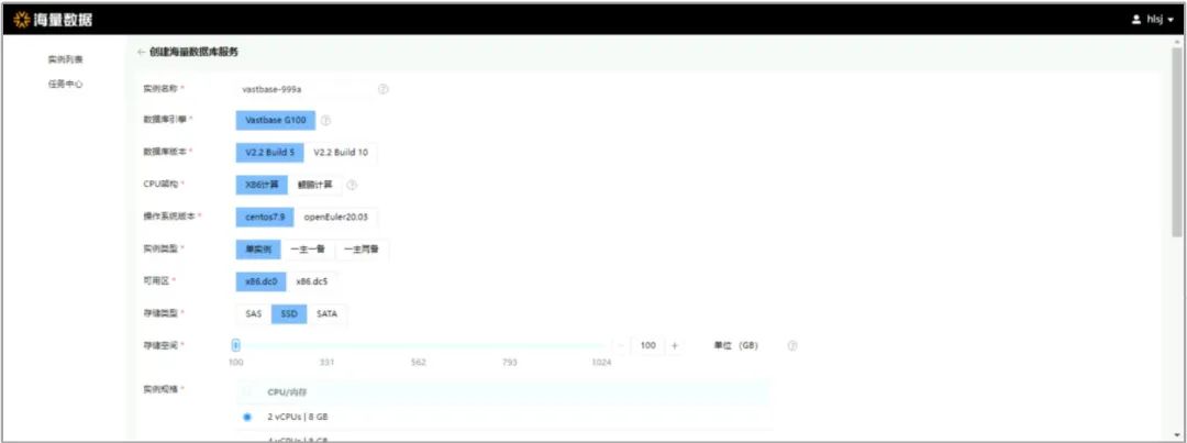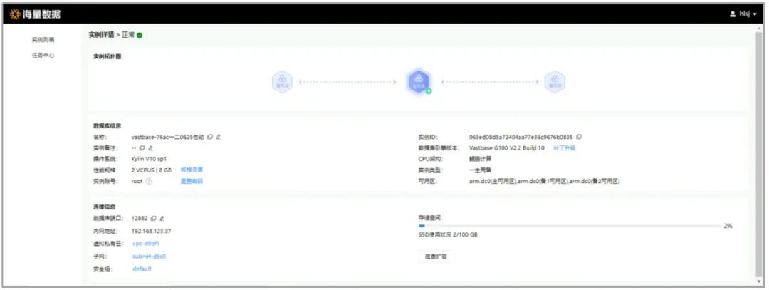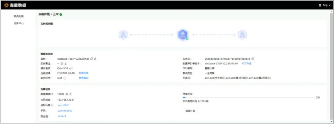 点击“创建实例”,填写相关参数并提交即可创建Vastbase数据库实例。实例架构可选择单实例、一主一备或一主两备,计算规格默认最小2vCPUs 8GB,最大支持16vCPUs 64GB;存储介质可选SSD、SATA或SAS,点击提交,开始创建实例。创建成功后,实例状态显示为“正常”。
